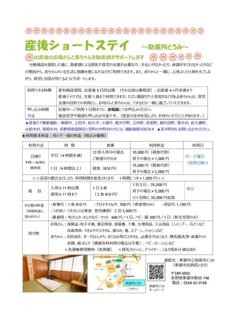 | 申し込み時期・方法 | 妊娠中~ご利用1日前までに、助産所とうみにお申し込みください。事前に施設見学できます。 定員を超える申込があった場合や分娩進行者がいる場合には、利用日をお待ちいただくことがあります。 |