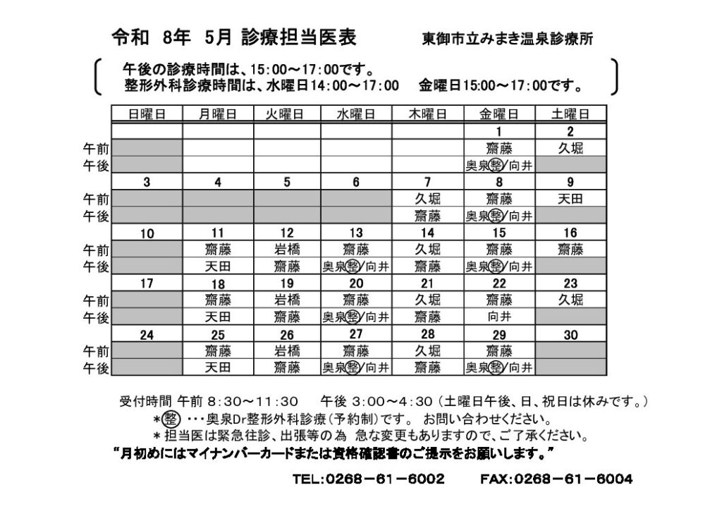 2026年5月分の診療担当医表を追加しました。