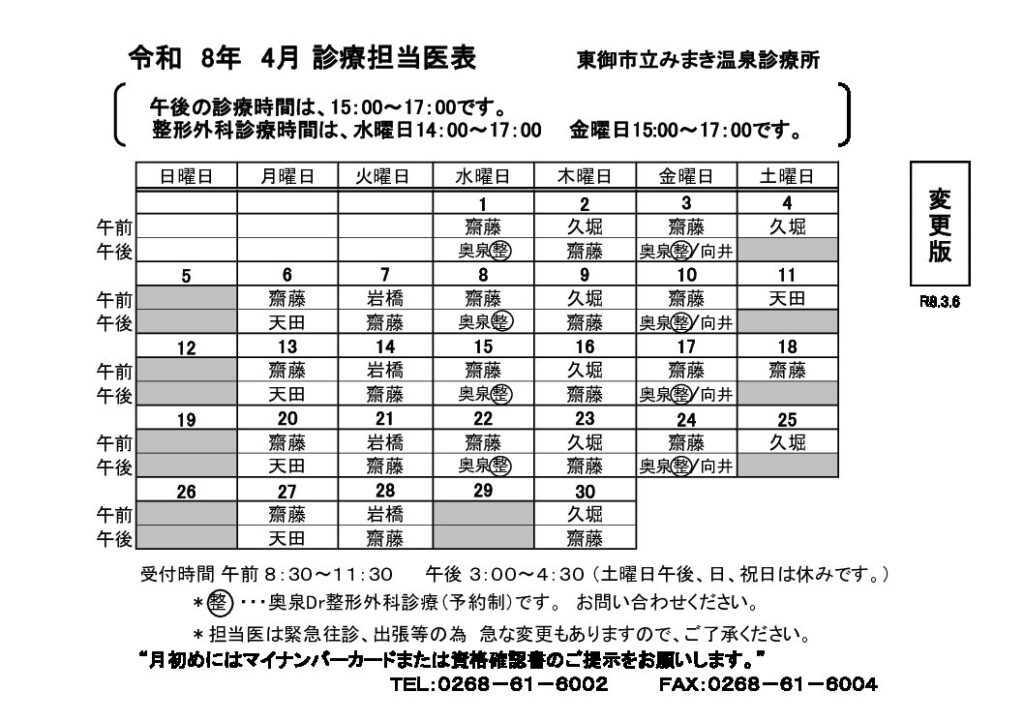 | 午前の部:午前8時30分~11時30分 午後の部:午後3時~4時30分 ただし、整形外科は午後2時~4時30分 | 電話:0268-61-6002 FAX:0268-61-6004 |